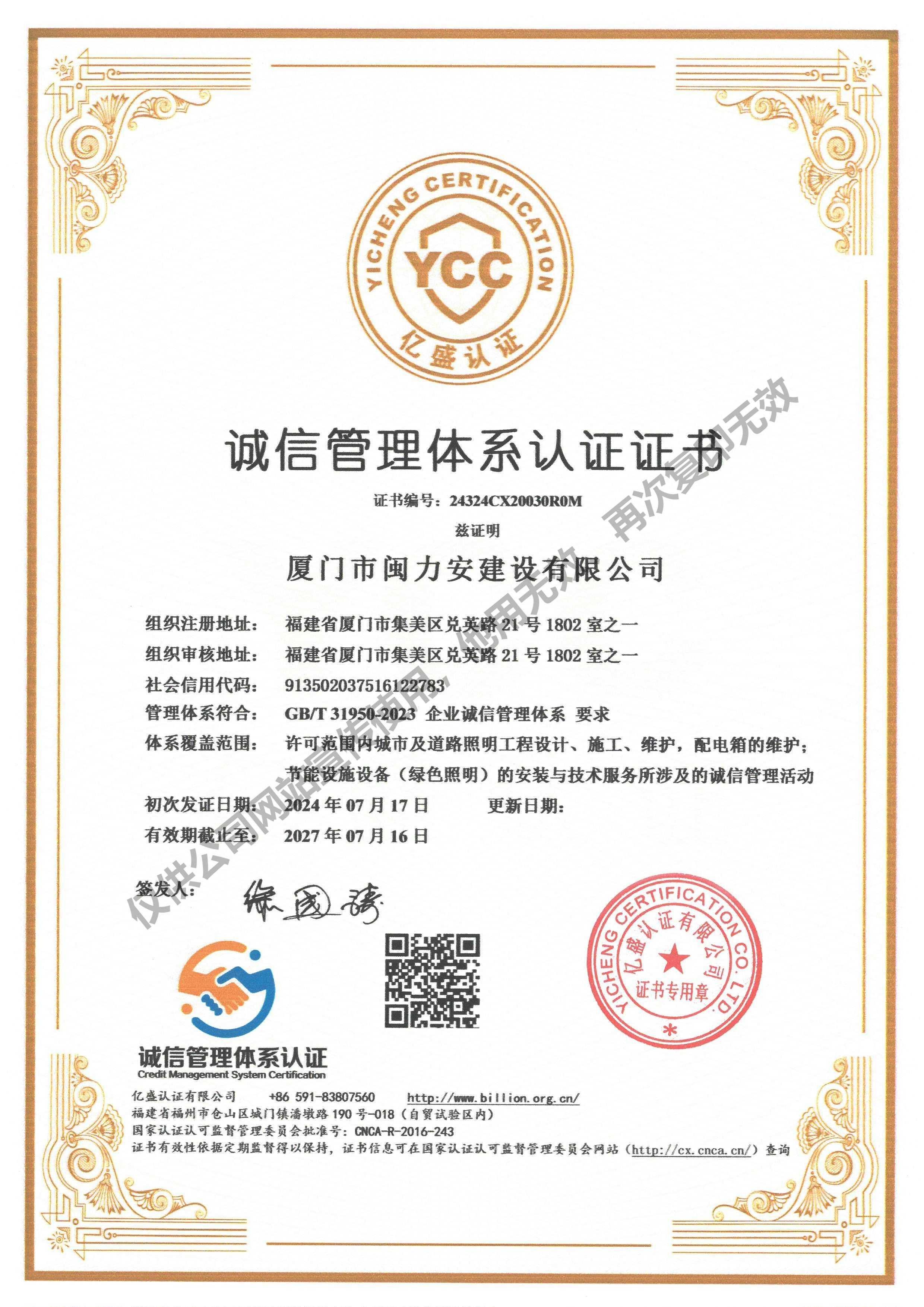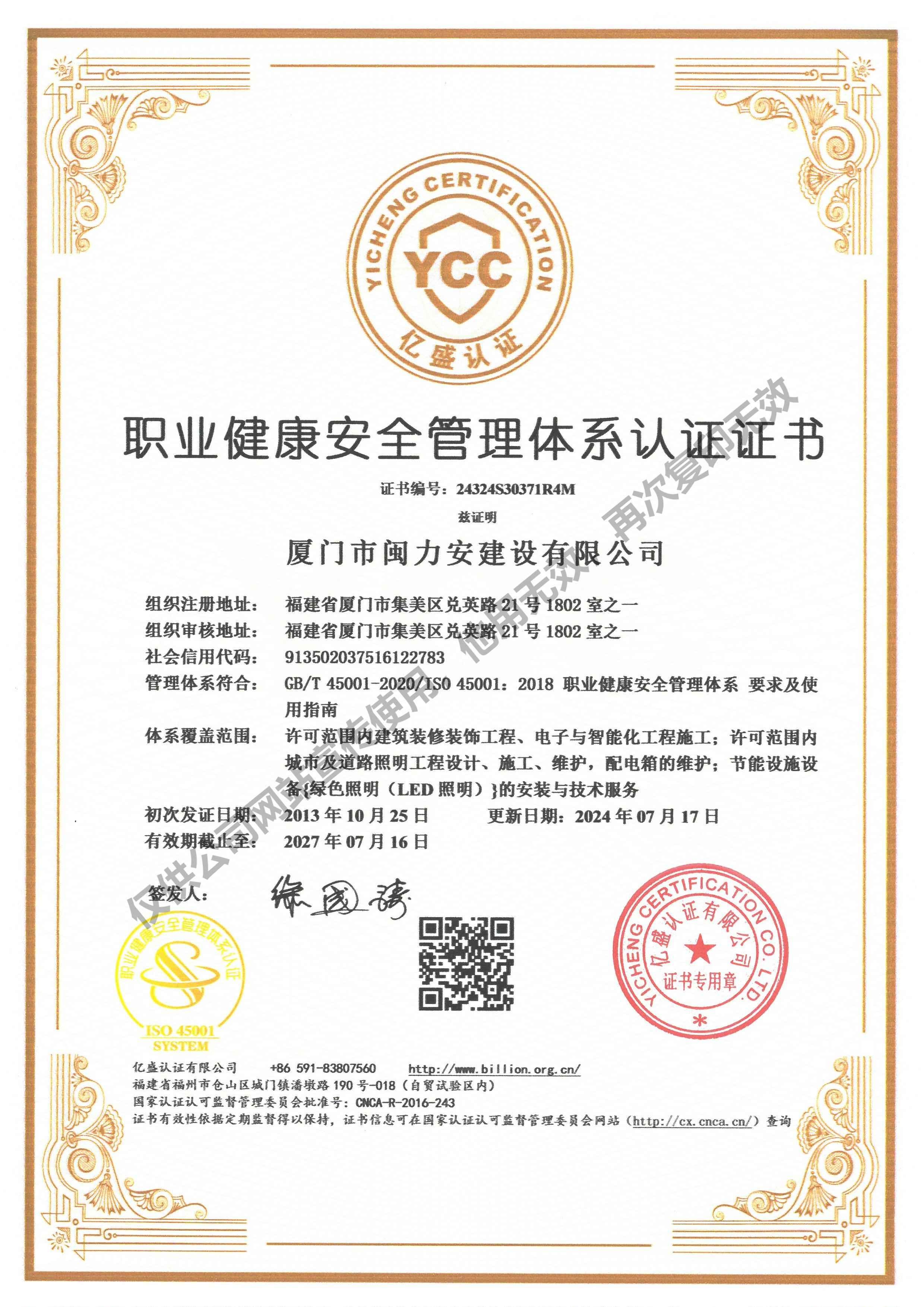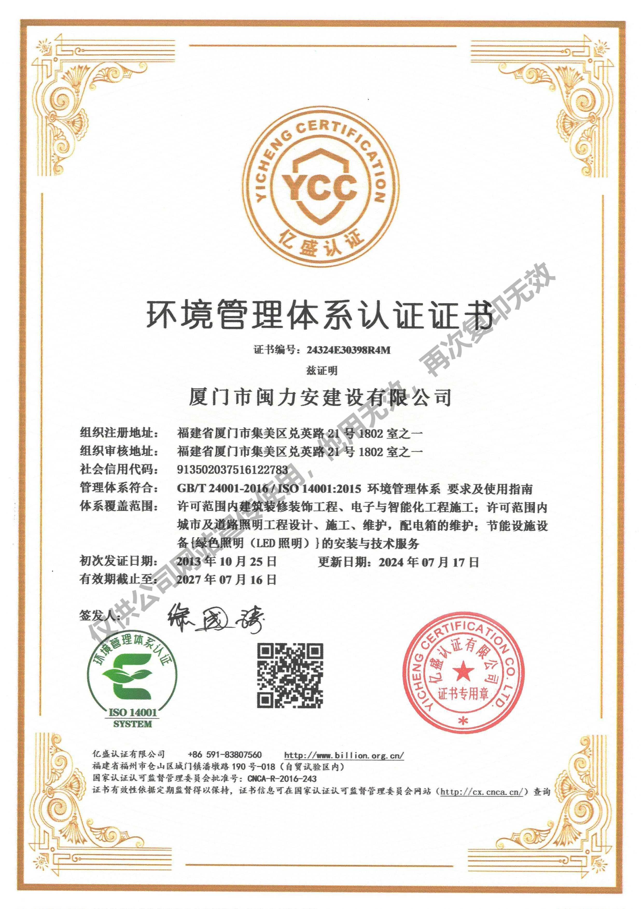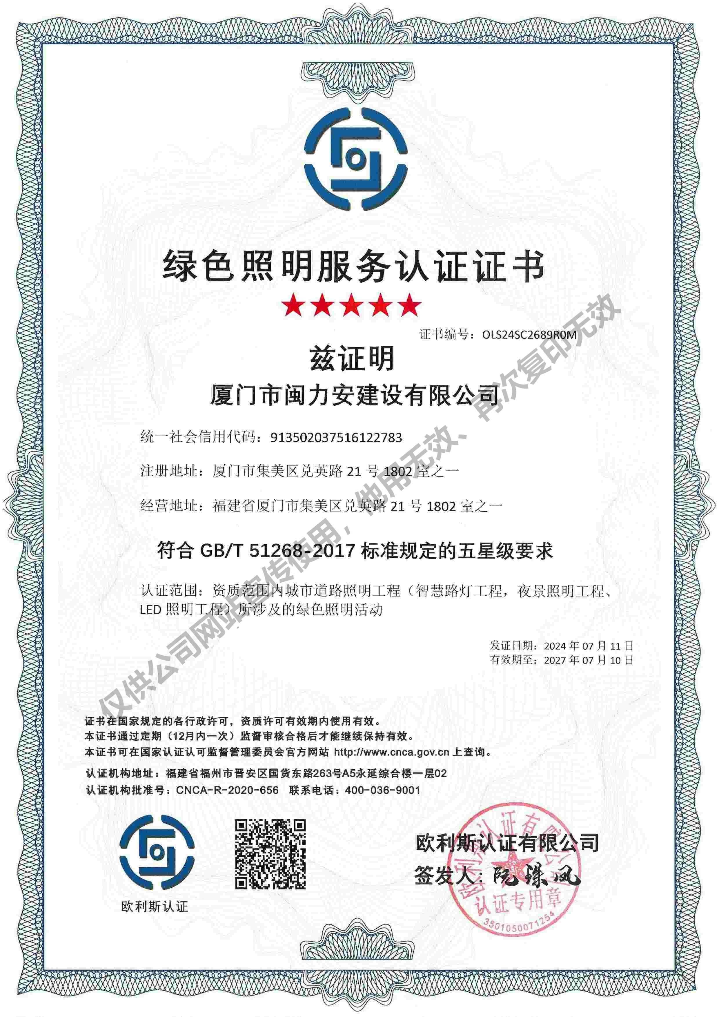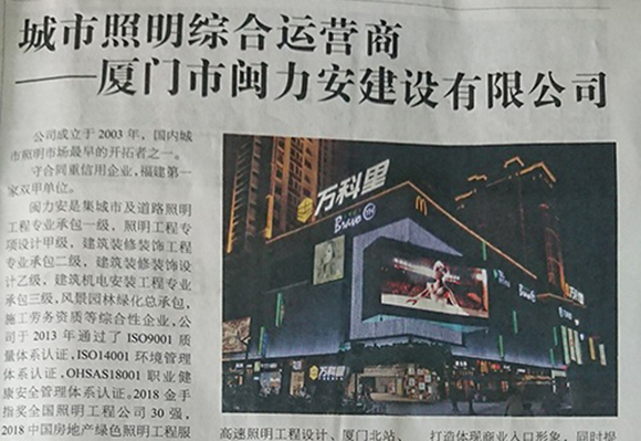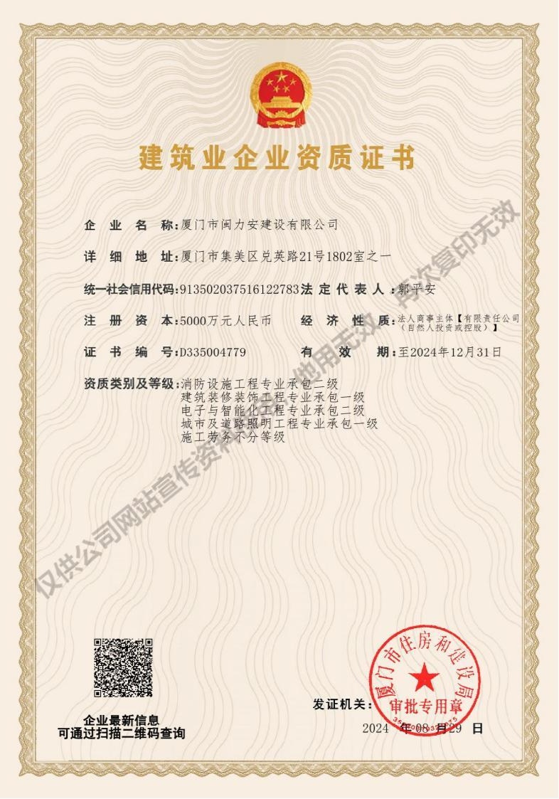 廈門市閩力安建設有限公司成立于2003年,公司取得市政公用工程施工總承包貳級、建筑裝修裝飾工程專業承包壹級、城市及道路照明工程專業承包壹級、電子與智能化工程專業承包貳級、消防設施工程專業承包貳級、電力工程施工總承包叁級、建筑機電安裝工程專業承包叁級、輸變電工程專業承包叁級、環(huán)保工程專業承包叁級、照明工程設計專項甲級、建筑裝飾工程設計乙級、施工勞務等資質的綜合型企業,公司于2013年通過了ISO9001質量體系認證,ISO14001環(huán)境管理體系認證,OHSAS18001職業健康安全管理體系認證。