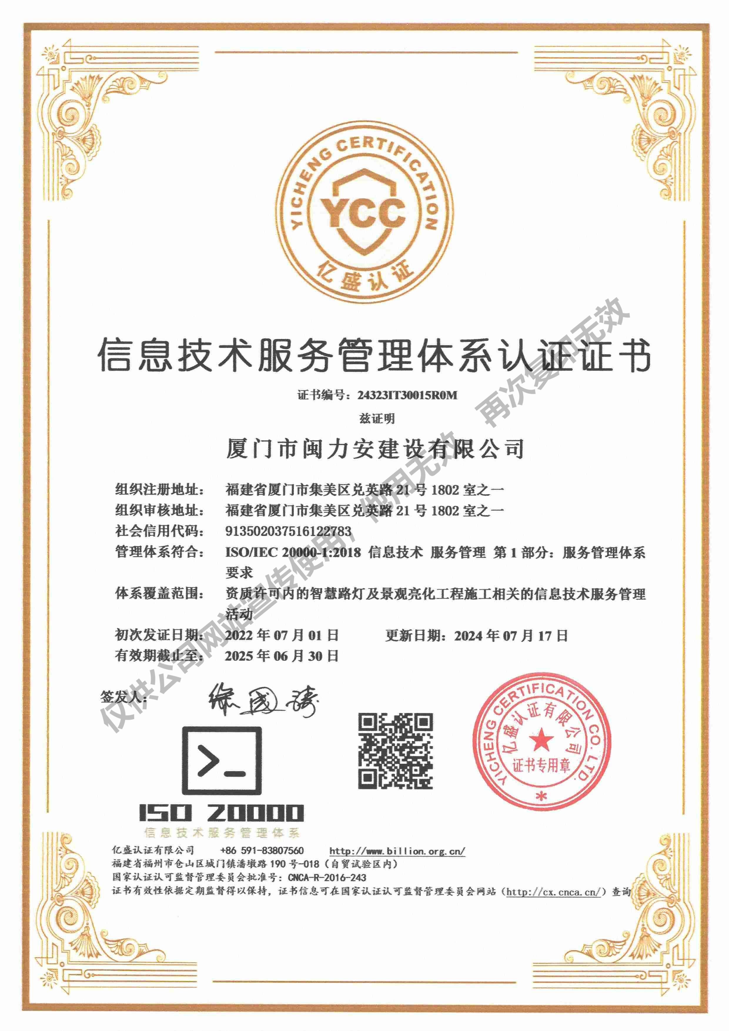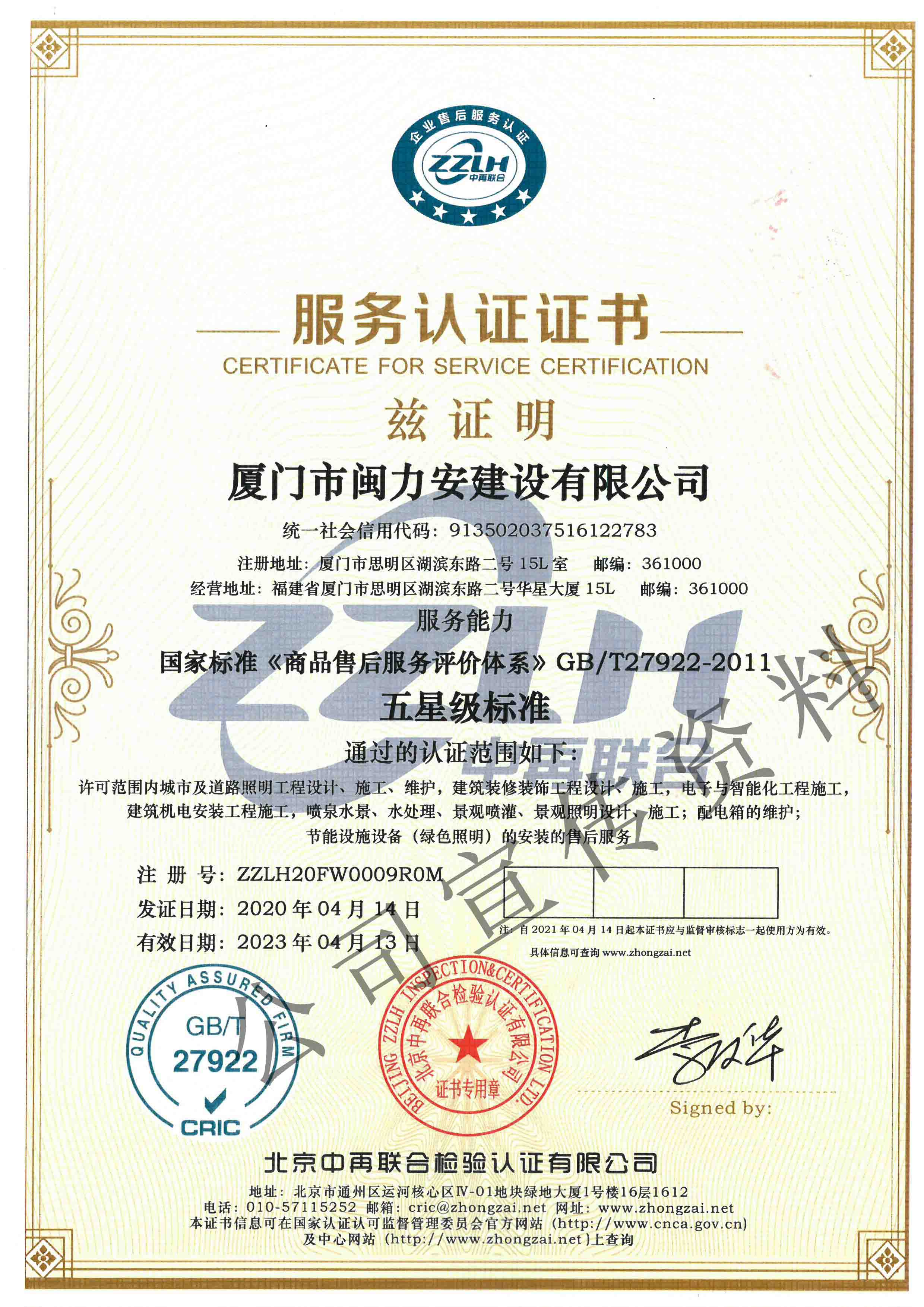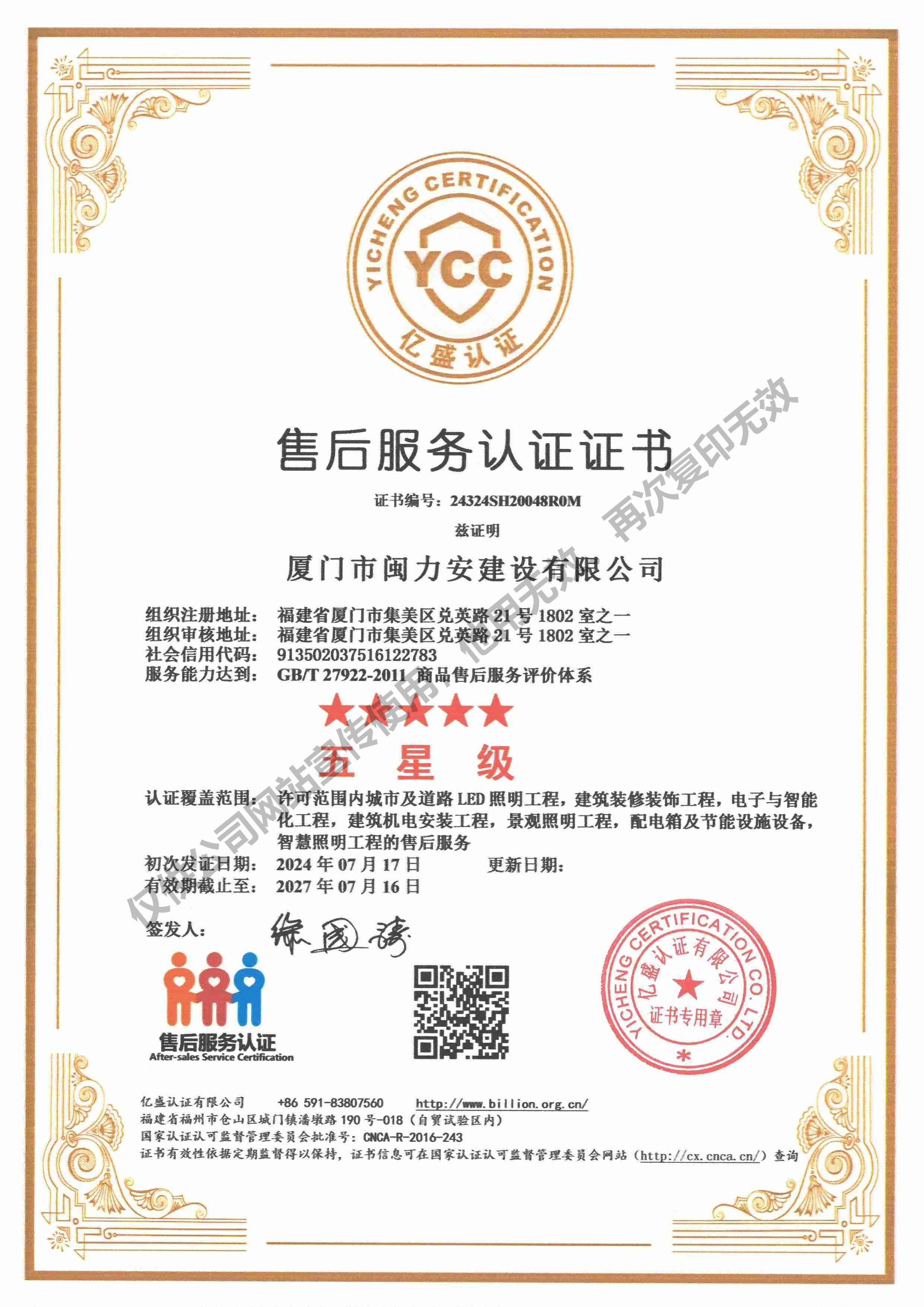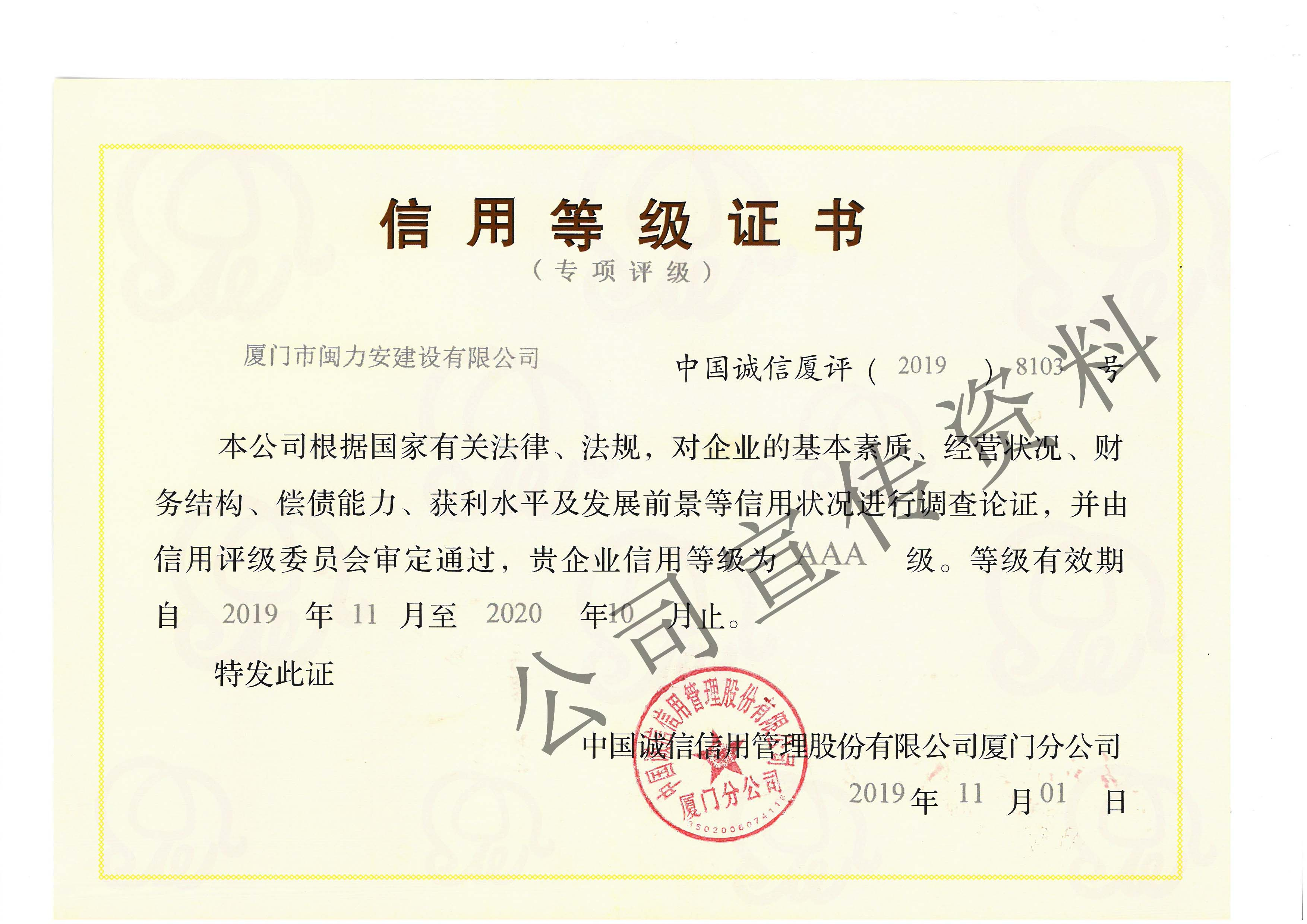 廈門市閩力安建設有限公司成立于2003年,公司取得市政公用工程施工總承包貳級、建筑裝修裝飾工程專業承包壹級、城市及道路照明工程專業承包壹級、電子與智能化工程專業承包貳級、消防設施工程專業承包貳級、電力工程施工總承包叁級、建筑機電安裝工程專業承包叁級、輸變電工程專業承包叁級、環(huán)保工程專業承包叁級、照明工程設計專項甲級、建筑裝飾工程設計乙級、施工勞務等資質的綜合型企業,公司于2013年通過了ISO9001質量體系認證,ISO14001環(huán)境管理體系認證,OHSAS18001職業健康安全管理體系認證。